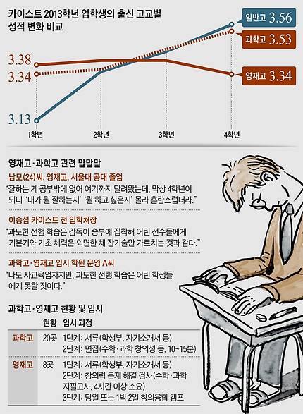 그러나 최근 카이스트가 공개한 2013년 신입생들의 출신 고교별 학점 변화를 보면 과학고·영재고 출신 학생들의 성적은 학년이 올라갈수록 지체되거나 떨어져 결국 일반고 학생들이 3~4학년 때 이들을 앞지르는 것으로 나타났다. 1학년 성적은 영재고(3.38점)와 과학고(3.34점) 출신들의 학점이 일반고(3.13점) 출신들보다 높지만, 3학년 땐 일반고 학생들이 영재고 학생들을 따라잡고 4학년이 되면 일반고 출신들(3.56점)이 과학고(3.53점)·영재고(3.34점) 출신들을 추월한다는 것이다.