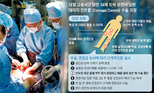 이 교수는 "기존 방식처럼 수술실에서 손상 부위를 다 마무리하려고 시간을 끌다가는 그 사이 환자가 사망한다"며 "핵심만 신속히 처리하고 병세가 조금 나아지면 다시 수술에 들어가는 방법"이라고 말했다. 대미지 컨트롤 수술 개념은 영국 해군의 피격 군함 처리 방법에서 비롯됐다. 군함이 폭격을 당하면, 일단 배가 침몰하지 않을 정도로 수리를 임시로 한 후 항구로 끌고 와 마무리하는 방식이다.