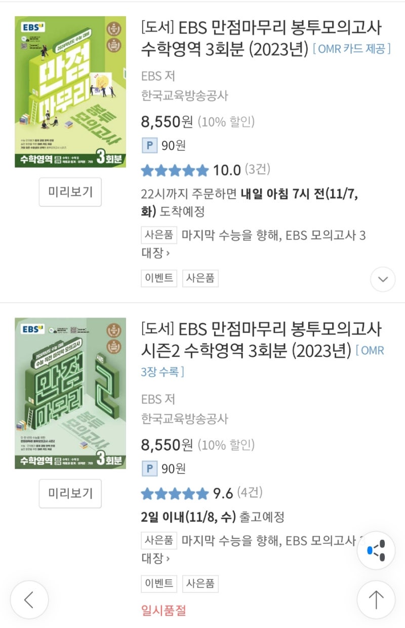 반면에 수학은 연계율이 뚜렷하게 체감되지 않습니다. 하지만 저는 주변에 수특과 수완을 제대로 보라고 시키고 있습니다. 더 나아가 비연계 EBS실전모의고사와 EBS만점마무리 시즌1과 시즌2까지 풀게끔 시켰습니다. 비연계 EBS까지는 잘 안 풀기 때문에 가르치는 분들도 잘 몰라 하지만, 몇 년 전 수능에 EBS final 실전모의고사에서 당시 봤으면 도움 될 법한 문제가 나오기도 했습니다. 위의 사례가 우연의 일치라고 하더라도 최소한 EBS 정도는 연계는 무조건 보세요. 수학만 놓고 얘기했을 때 비연계까지 보면 좋다고 생각합니다. 수학 비연계 실모는 위로 넘기는 실전모의고사와 봉투모의고사인 만점마무리 시즌1,2가 있습니다. 시간이 없으면 여기서 몇 문제만이라도 선별해서 보세요. 저도 여기에서 볼 만한 문제를 간추려서 한번 올려보겠습니다.