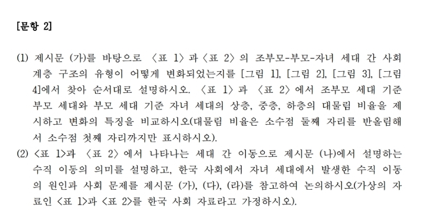 지시 사항: '<표 1>과 <표 2>의 조부모 ~ 자녀 세대 간 사회 계층 구조 유형이 어떻게 변화했는지