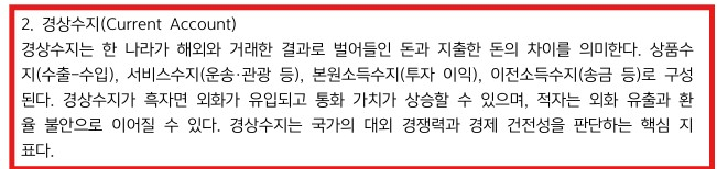 출제 맥락: 경상수지는 대입 논술에서 거시경제·국제경제 주제로 자주 등장합니다. 주로 국가 간 무역 구조, 환율, 산업 경쟁력, 국가 성장 전략 같은 흐름 속에서 다뤄집니다.