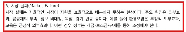 출제 맥락: 정부의 시장 개입(규제, 세금, 보조금 등)이 왜 필요한지를 설명하는 가장 중요한 근거로 사용됩니다. 외부효과, 공공재, 정보비대칭과 함께 다뤄집니다.