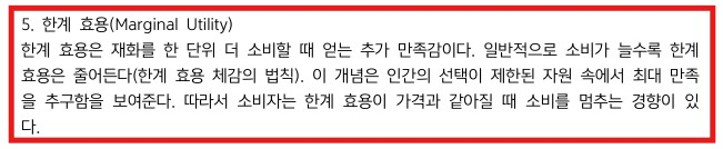 문제 예시: 제시문 (가)의 한계효용 체감의 법칙을 이용하여, 제시문 (나)의 인물이 왜 더 이상 물건을 구매하지 않았는지 설명하시오.