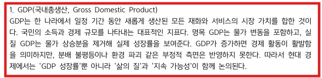 출제 맥락: 경제 성장의 긍정적 측면과 부정적 측면을 동시에 다룰 때 핵심 지표로 등장합니다. 주로 성장과 분배, 환경 문제, 삶의 질과 같은 주제와 연결됩니다.