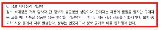 출제 맥락: '시장 실패'의 핵심 원인 중 하나로, 시장의 신뢰 문제를 다루거나 정부의 인증제도나 정보 공개 정책이 왜 필요한지 주장할 때 쓸 수 있습니다.