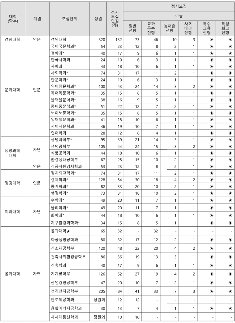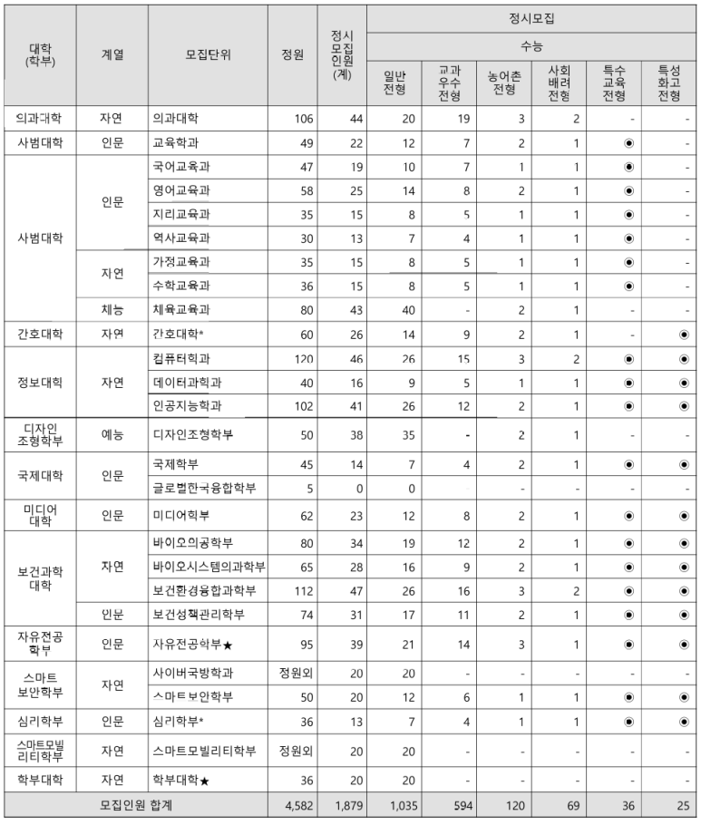 ▶전형 방법: 수능 100%(사이버국방학과, 체육교육과, 디자인조형학부 제외)