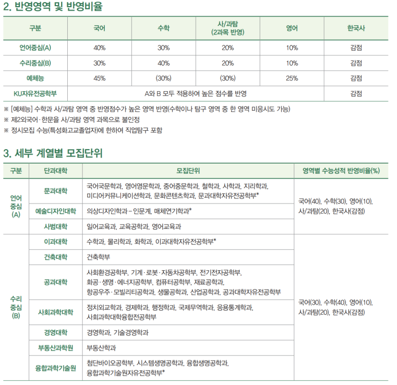 ** 인문, 예체능 계열은 국어 반영 비율이, 자연, 컴퓨터·AI학부는 수학 반영 비율이 높으므로 잘 체크해야 합니다!