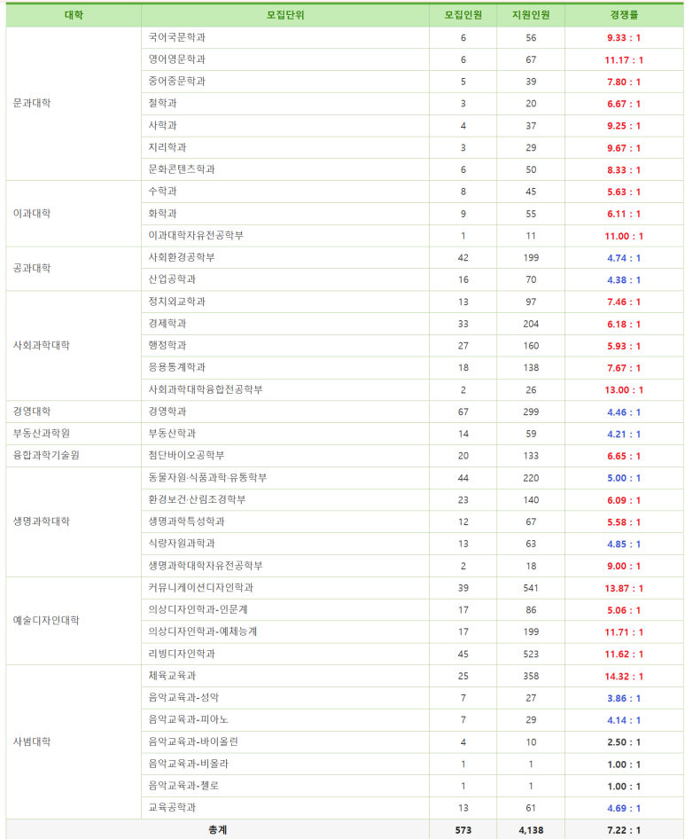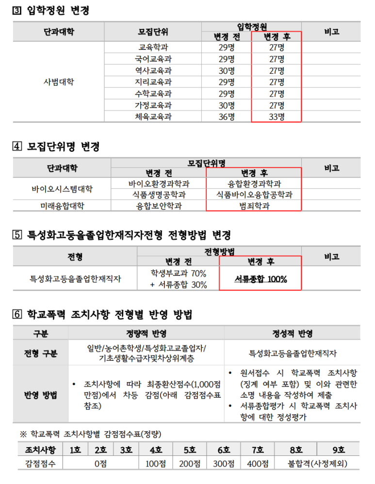 시대의 흐름에 따른 새로운 학과가 신설되었고, 융합환경과학과와 에너지신소재학과도 모집 인원을 증가했네요. 또한 타 대학과 유사하게 광역화 모집단위 선발이 확대된 점, 학교폭력 조치사항 반영이 된다는 점등을 눈여겨 보시면 좋을 것 같습니다.
