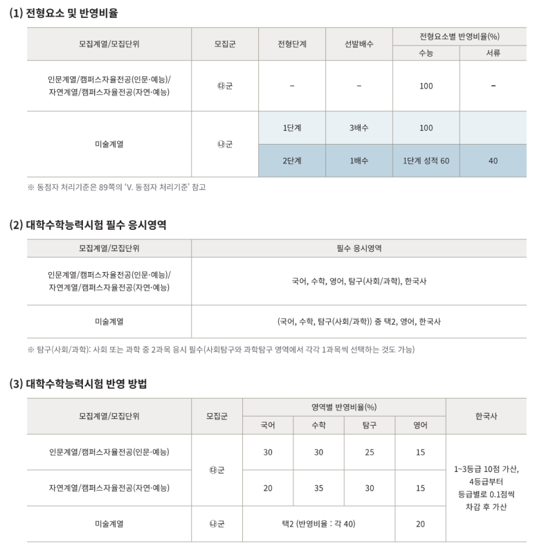 인문계열 / 캠퍼스 자율 전공, 자연계열 / 캠퍼스 자율 전공은 미술계열과 달리 국어, 수학, 영어, 탐구, 한국사를 필수적으로 응시해야 합니다.