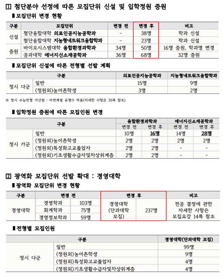 우선 첨단분야 선정에 따른 모집단위 신설 및 입학정원 증원이 가장 먼저 눈에 띄는데요!