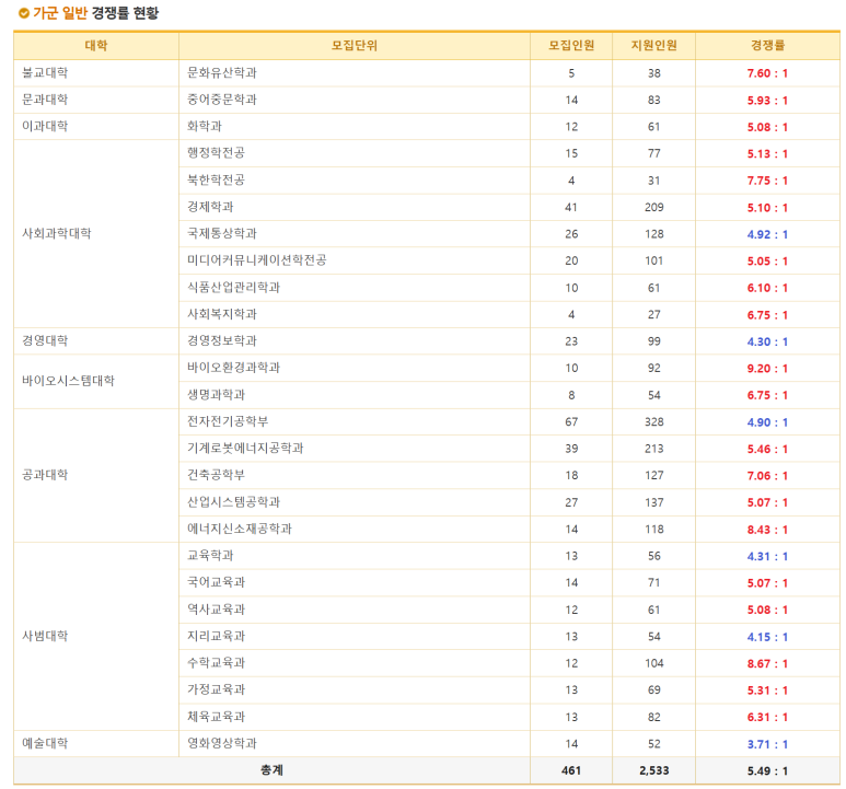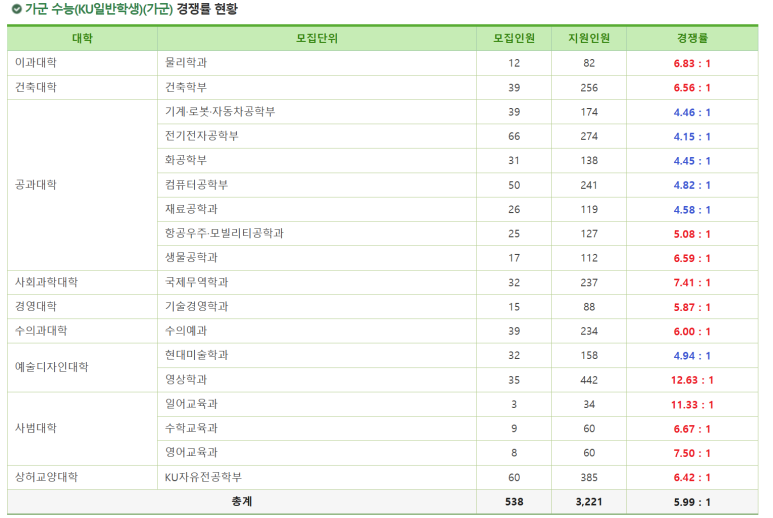 정시 가군 수능우수자전형은 2~3점대의 낮은 경쟁률을 보였습니다.