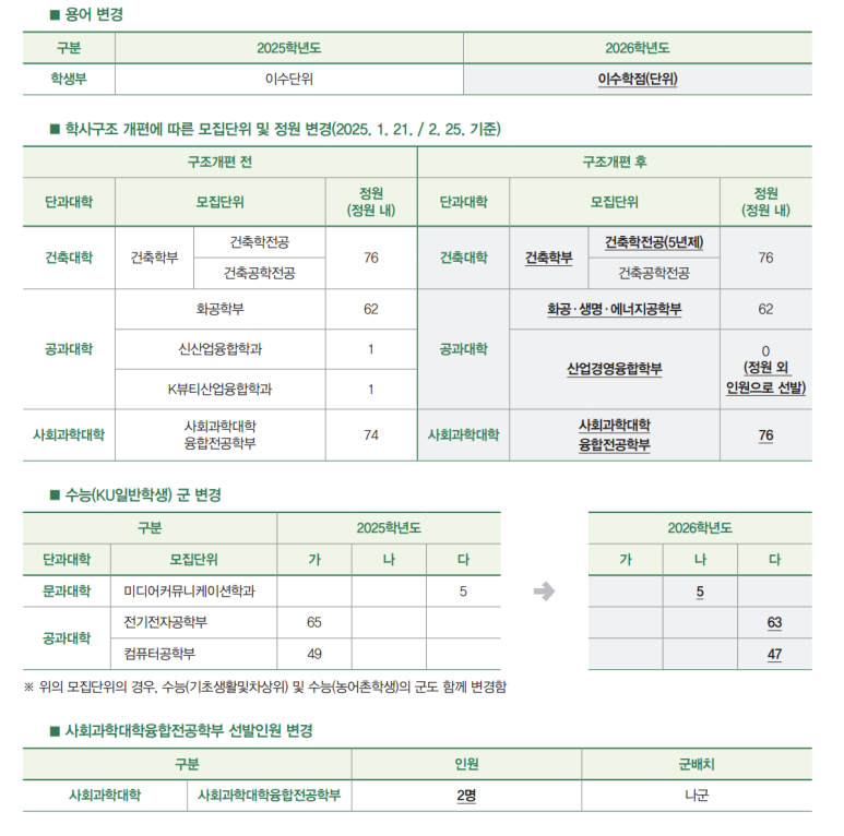 눈여겨 보실 주요 사항은 학사구조 개편에 따른 모집단위 및 정원 변경입니다. 또한, 일부 학과는 수능 군이 변경되었네요.