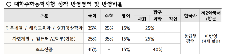 인문, 예체능 계열은 국어 35%, 수학 25%, 영어 15%, 탐구 25%, 자연 계열은 국어25%, 수학 35% 영어 15%, 탐구 25%가 반영됩니다.