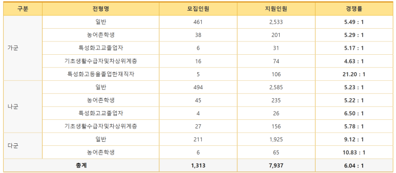 가군, 나군, 다군의 평균 경쟁률은 6.04:1인데요.