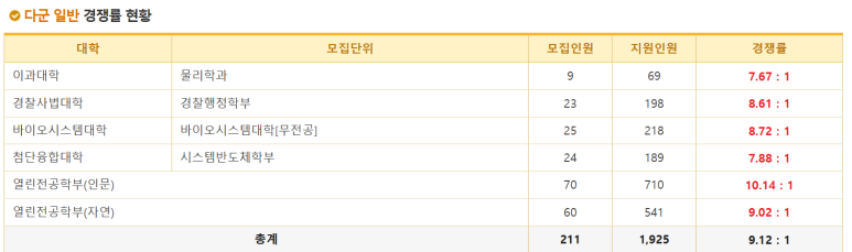 ▶수능(일반) 다군에서 경쟁률이 가장 낮았던 모집단위 물리학과 7.67 : 1