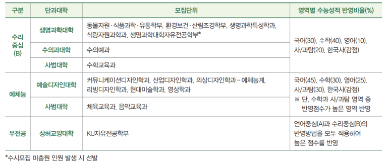 언어중심(A)은 국어 40%, 수학 30% 탐구 20%, 영어 10%, 한국사(감점), 수리중심(B)은 30%, 수학 40%, 탐구 20%, 영어 10%, 한국사(감점) 반영된다고 하니 각각 해당하는 모집단위와 반영 비율을 잘 확인하셔야 합니다!