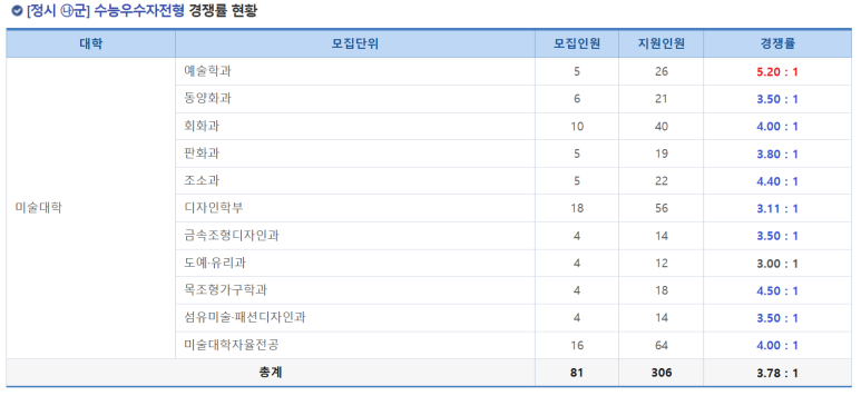 ▶나군 수능우수자전형에서 경쟁률이 가장 높았던 모집단위 예술학과 5.20 : 1