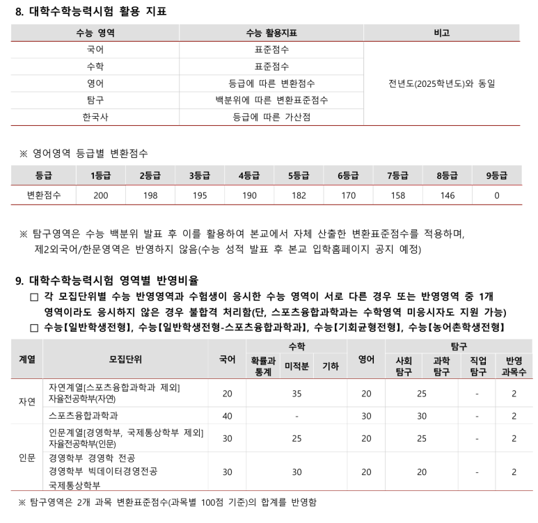 ▶지원자격: 지원하고자 하는 모집단위에서 반영하는 영역(과목)의 2026학년도 대학수학능력시험 성적이 있는 자로서, 고등학교 졸업(예정)자 또는 「초․중등교육법 시행령」제98조에 의하여 동등의 학력이 있다고 인정된 자