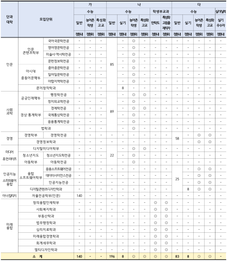 광운대는 가군, 나군, 다군에서 모집을 하고 정원 내 전형으로는 일반학생, 스포츠융합과학과, 기회균형전형이 있는데요, 이 중 모집인원이 가장 많은 수능일반학생전형을 살펴보도록 하겠습니다:)