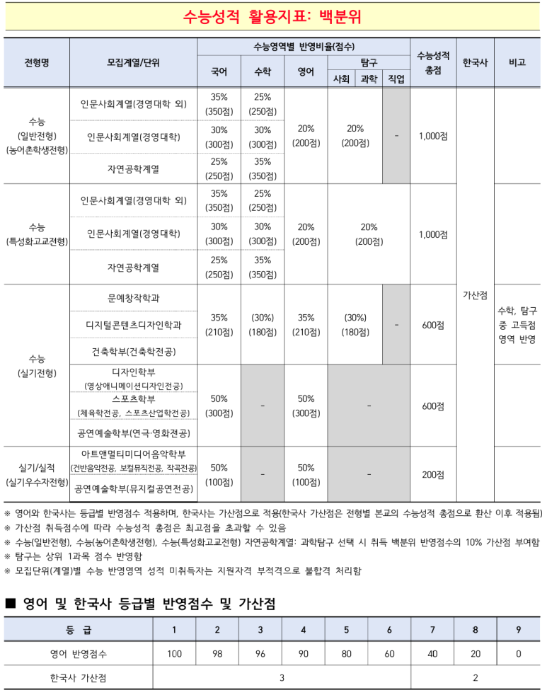 일반 전형 인문사회계열(경영대학 외)는 국어 35%, 수학 25%, 영어 20%, 탐구 20%, 경영대학은 국어 30%, 수학 30%, 영어 20%, 탐구 20%, 자연공학계열은 국어 25%, 수학 35%, 영어 20%, 탐구 20%이 반영되니 각 모집계열을 잘 확인하시기 바랍니다:)