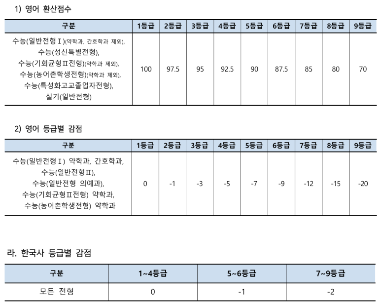 한국사는 5~6등급은 -1점, 7~9등급은 -2점의 감점이 있으니 잘 알아두시기 바랍니다. :)