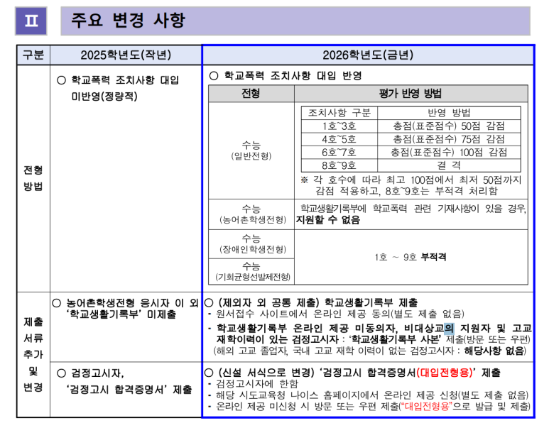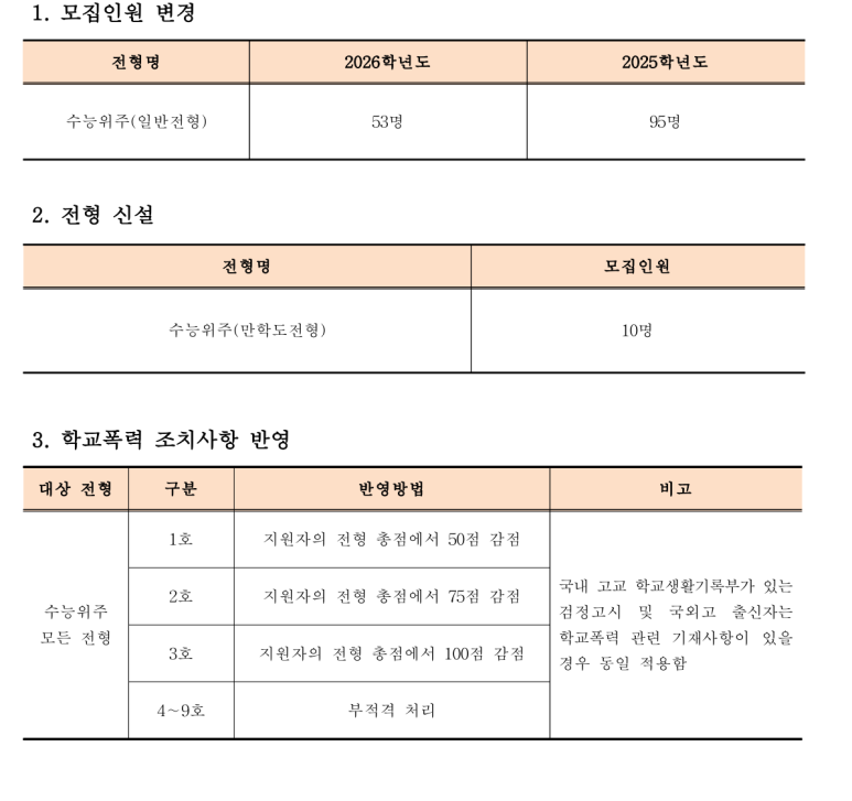 또한 만학도 전형이 신설되었고, 타학교와 동일하게 학교 폭력 사항과 관련하여 감점 혹은 부적격 처리가 됩니다.
