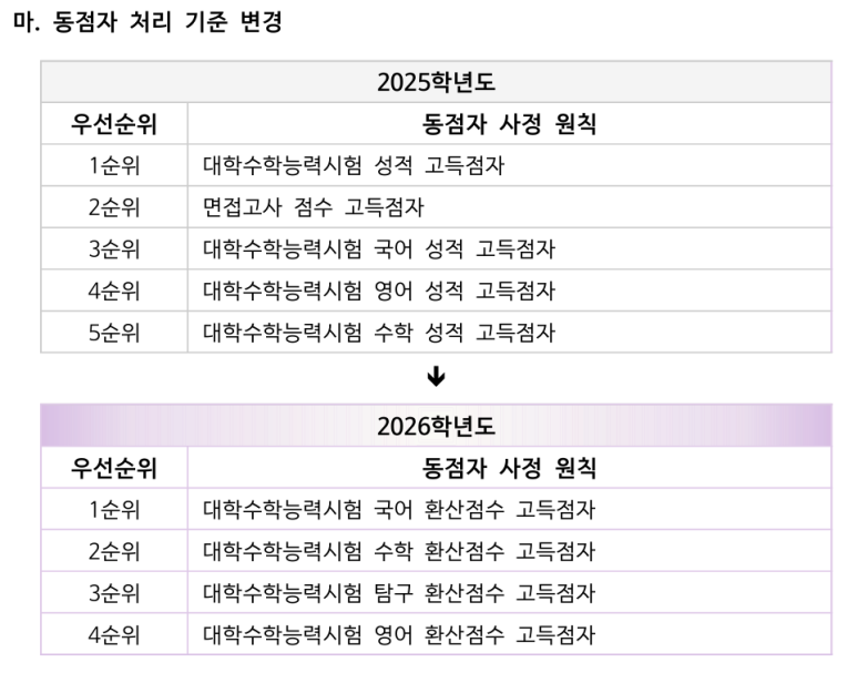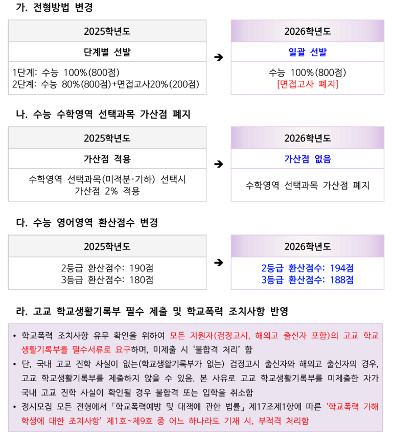 면접고사가 폐지된 것, 수학영역 가산점이 폐지된 것 등이 주요한 변경사항이 되겠습니다!