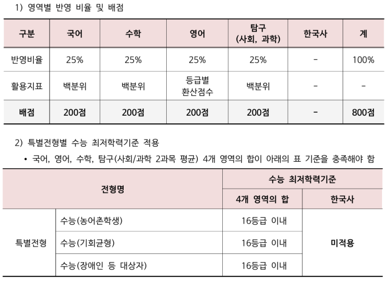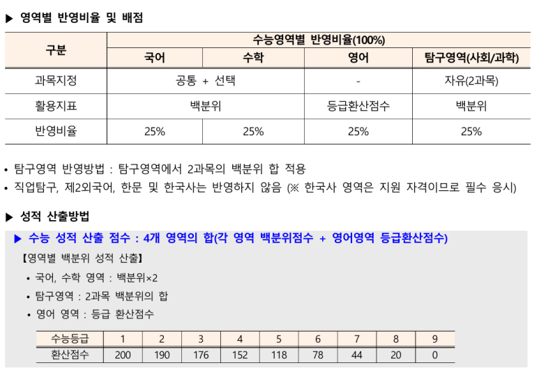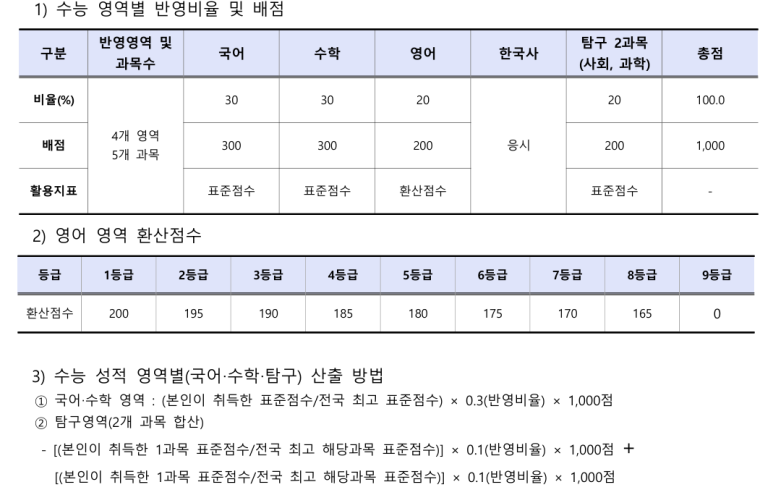 표준점수를 반영하며, 국어와 수학은 30%, 영어와 탐구는 20%의 비율로 반영합니다! 그리고 한국사는 가산점 부여 없이 응시 여부만 확인합니다.