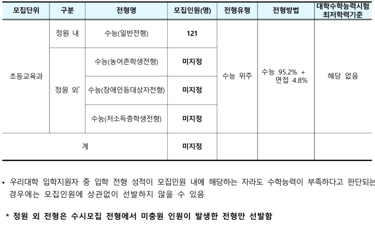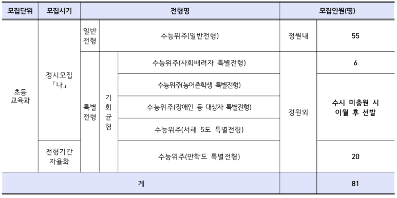 다른 교대와 마찬가지로 나군에서 모집하며 정원 내 전형은 한 개뿐입니다:)