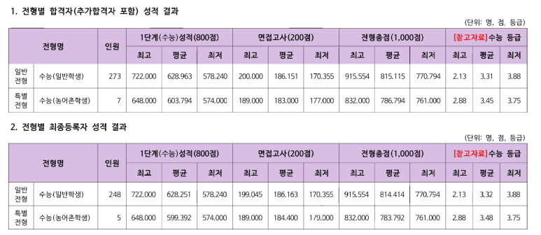 경쟁률은 3.13:1에서 2.29:1로 하락했으며, 수능 평균 등급은 2.88에서 2.93으로 하락했습니다.