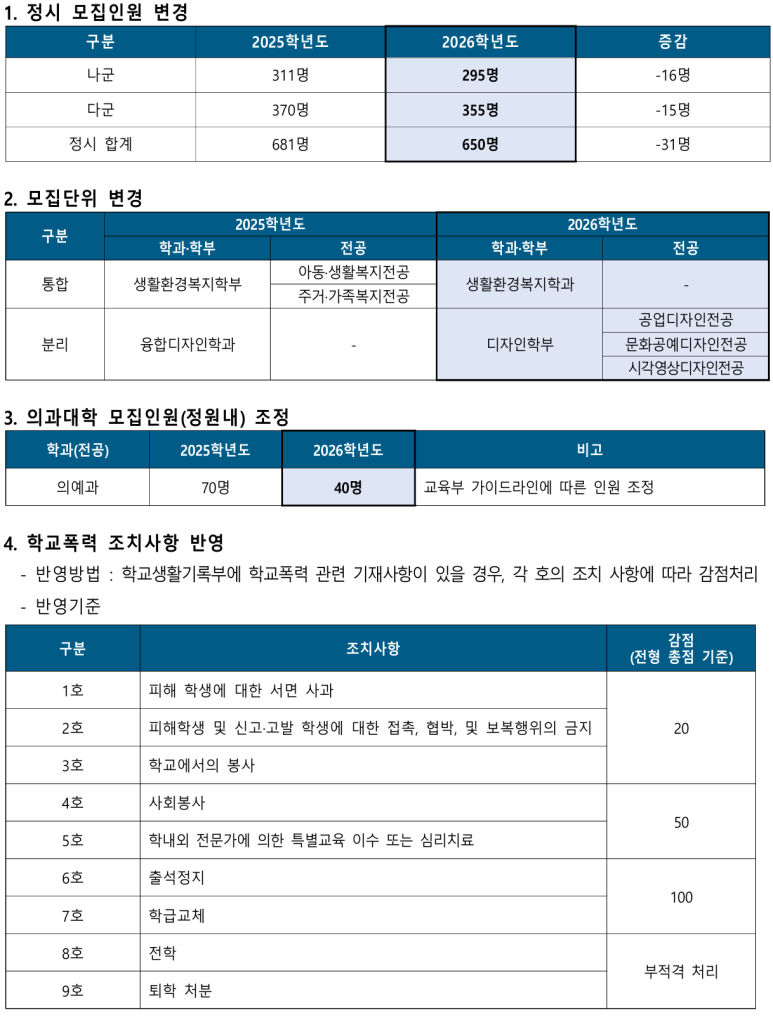 정시 모집인원이 줄어들었다는 점이 가장 주목할만한 변경 사항이 되겠습니다~ 나머지 내용은 위의 표를 참고해 주시기 바랍니다!
