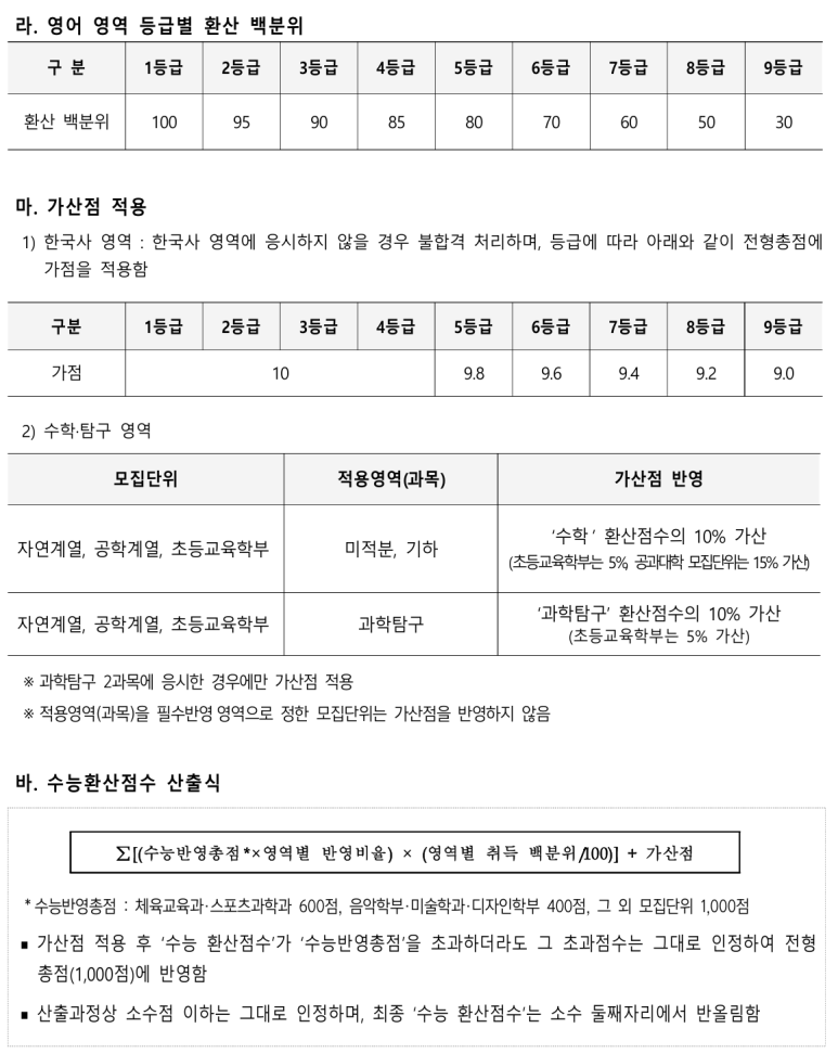 인문사회계열, 체육교육과는 국어 30%, 수학 20%, 영어 20%, 탐구 30%, 자연계열, 공학계열은 국어 20%, 수학 30%, 영어 20%, 탐구 30%가 반영됩니다. 한국사는 등급에 따라 가산점이 적용되며 자연계열, 공학계열, 초등교육학부의 경우 미적분, 기하, 과탐 응시 시 가산점 10%가 부여됩니다. 구체적인 내용은 위의 표를 참고해 주시기 바랍니다~