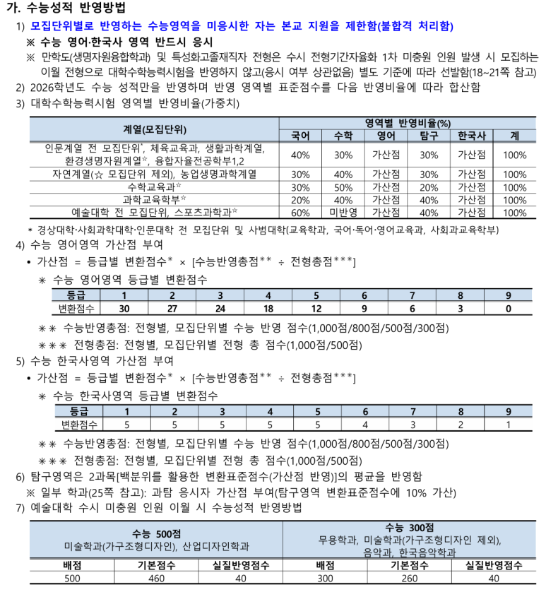 ※ 2026학년도 대학수학능력시험에서 한국사 영역을 포함한 모집단위별 수능 반영영역에 모두 응시해야 함