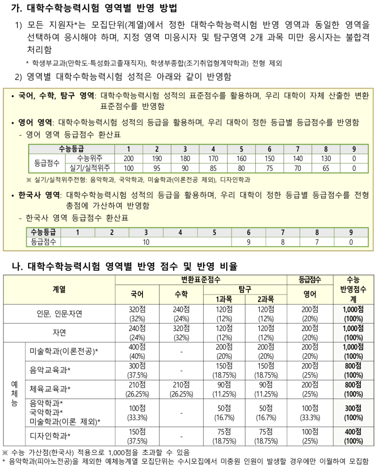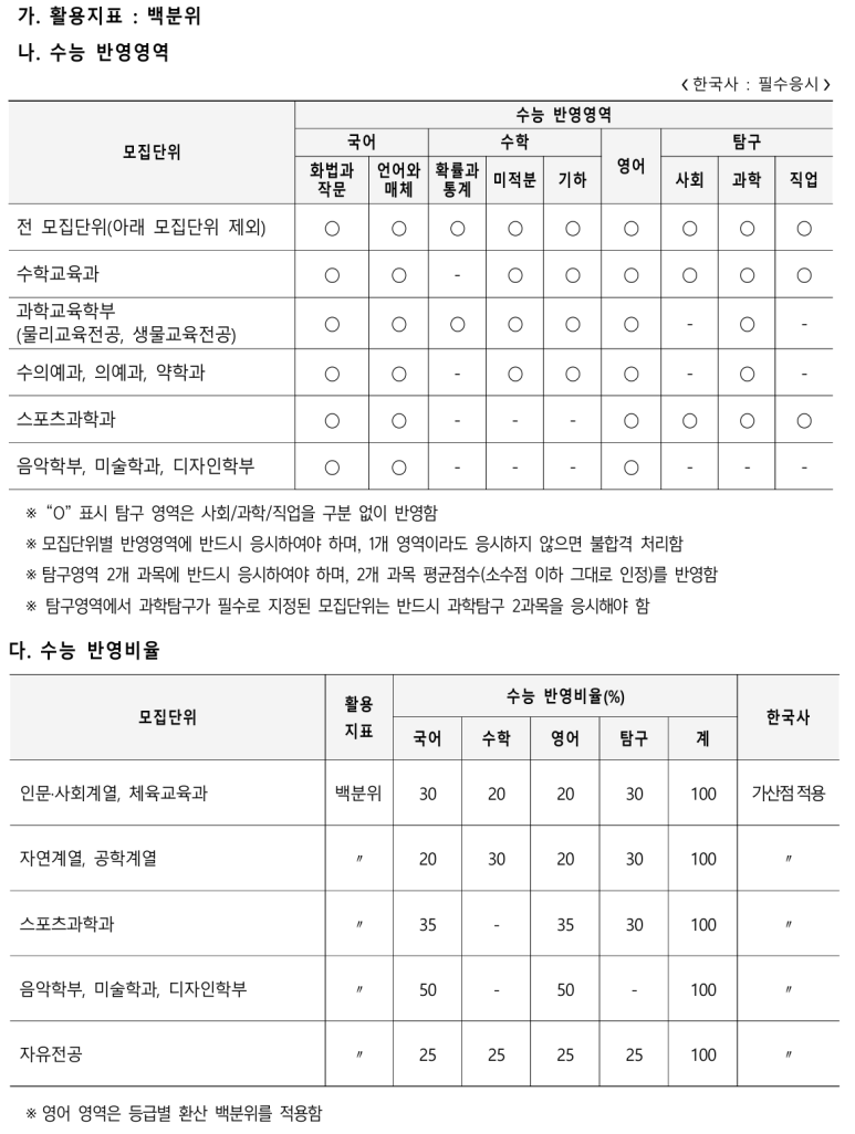 모든 계열(모집단위)가 영어, 한국사 영역은 가산점으로 부여됩니다. 그리고 인문계열, 체육교육과, 생활과학계열, 환경생명자원계열, 융합자율전공학부 1, 2는 국어 40%, 수학 30%, 탐구(2과목) 30%, 자연계열, 농업생명과학계열은 국어 30%, 수학 40%, 탐구(2과목) 30%, 수학교육과는 국어 30%, 수학 50%, 탐구(2과목) 20%, 예술대학, 스포츠과학과는 국어 60%, 수학 미반영, 탐구 40%(2과목) 반영되니 참고하시기 바랍니다 :)