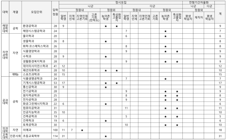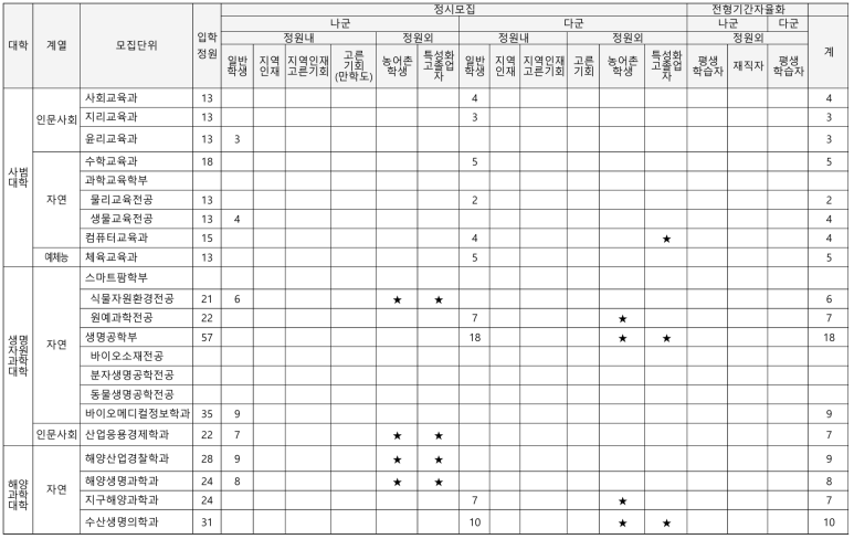 ▶수능(일반전형)에서 최종 등록자 등급 평균이 가장 낮았던 모집단위 [가군] 스마트수산자원관리학과 5.04 [나군] 기관시스템공학과 4.69