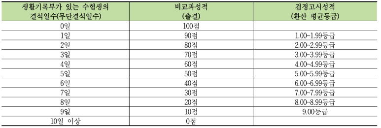 학생부 비교과성적(출결) 반영점수표는 아래 표를 참고해 주시기 바랍니다!