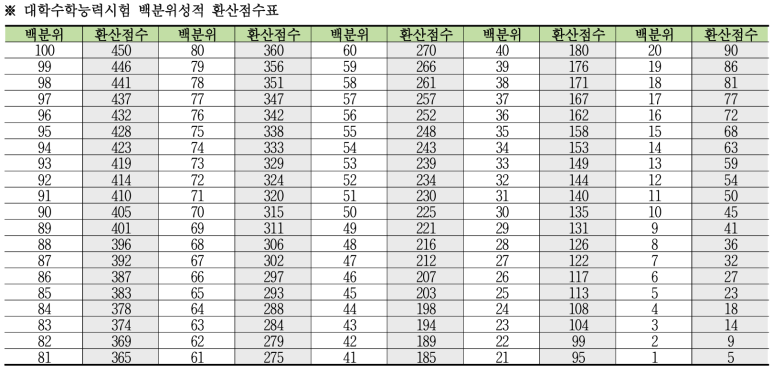 삼육보건대는 국/수 중 우수 영역 1개(백분위) 40% + 영어등급(환산점수) 40% + 탐구영역 중 우수과목 1개(백분위) 15% + 한국사 등급(환산점수) 5%를 반영합니다! 영어 및 한국사 영역 환산점수표는 위의 표를 참고해 주시기 바랍니다~