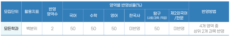 대전보건대는 상위 2개 과목의 백분위 평균점수를 반영합니다. 단, 상위 2개 과목이 모두 탐구 영역일 경우 선택한 과목 중 성적이 좋은 1개 과목만 반영합니다. 한국사와 제2외국어/한문 영역은 반영하지 않습니다.