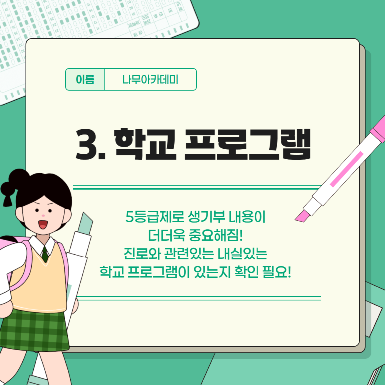 내신 등급이 5등급으로 개편되었습니다. 대학교에서는 이러한 변화에 발맞춰 신입생 모집의 변별력을 기르기 위해 수능 최저 기준을 강화하거나 생기부 기록을 더욱 꼼꼼하게 확인할 것입니다. 따라서 생기부에 유의미하게 기록될 비교과 활동, 학교 프로그램이 더욱 중요해질 것임을 알 수 있습니다. 희망 진로와 관련된 동아리가 있는지, 내실있는 대회 및 프로젝트 등을 진행하고 있는지를 확인해 봐야 합니다.