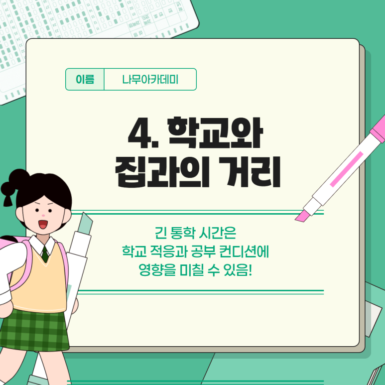 학교와 집과의 거리도 학교를 선택할 때 잘 따져보아야 하겠습니다. 학교에서 집까지의 거리가 멀수록 등하교 하면서 시간이 많이 걸리게 되겠죠? 또한 버스 정류장이 학교에서 멀어서, 버스를 내리고서도 한참 걸어야 한다거나 언덕에 학교가 있는 경우 등 이미 1교시 시작 전부터 지쳐있을 겁니다. 고등학교 공부가 체력 싸움인만큼, 학교가 너무 멀거나 등교하기 힘들다면 추천하지 않습니다. 통학 시간에 잠을 더 자거나 공부를 조금더 할 수 있다면 좋겠죠?