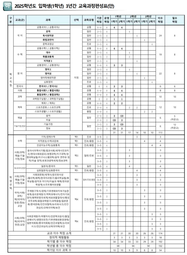 한 고등학교 2025학년도 입학생의 교육과정편성표인데요.