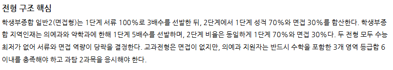 제주대 의예과는 학생부종합 면접형과 지역인재 전형에서 2단계 면접 30%를 반영한다. 면접 시간은 약 15분 내외이며, 수능최저는 없다. 반면 교과전형은 면접이 없고 의예과는 수학 포함 3개 영역 등급합 6, 과탐 2과목 응시 필수라는 수능최저를 적용한다.