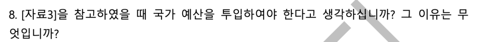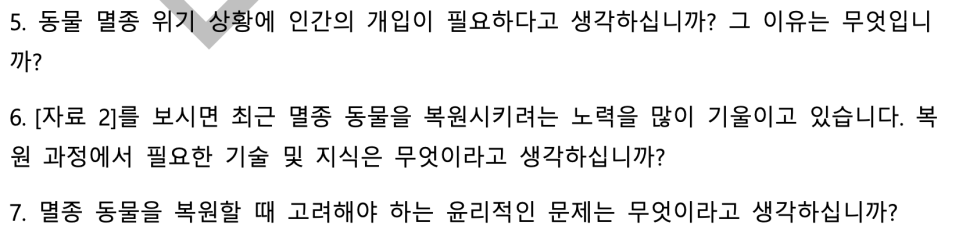 인간의 개입, 멸종 복원에 필요한 기술, 윤리적 논의, 국가 예산 투입 여부 등 한가지 토픽을 가지고 사회적, 윤리적, 법률적, 다양한 시각에서 시험자의 생각을 알아보고 있습니다.