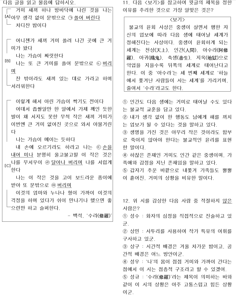 예를 들어, 아래는 고2 교과서의 '수라'에 대한 문제와, 고1 교과서의 '수라'에 대한 문제입니다.