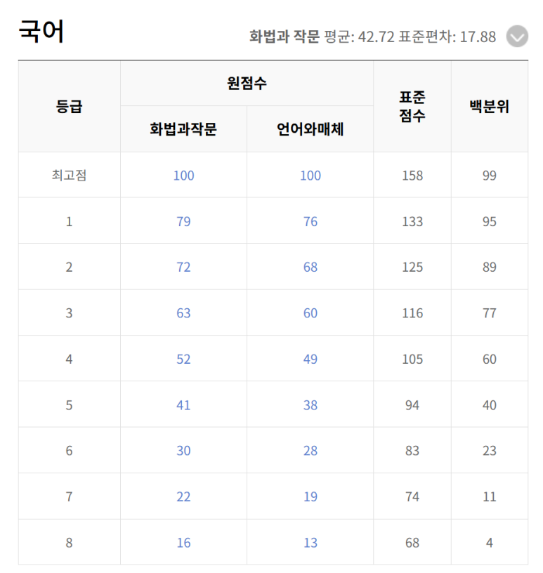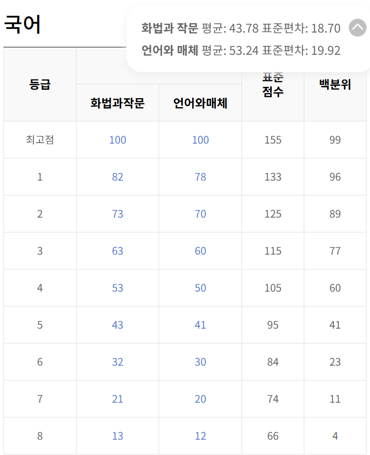 등급컷은 역시 화법과 작문의 컷이 언어와 매체의 컷보다 근소하게 높은 것을 확인할 수 있으며, 1등급컷이 각각 79, 76인 것을 통해 난이도가 쉽게 출제되었지만 등급컷이 그에 비해 낮은 편임을 알 수 있겠습니다.