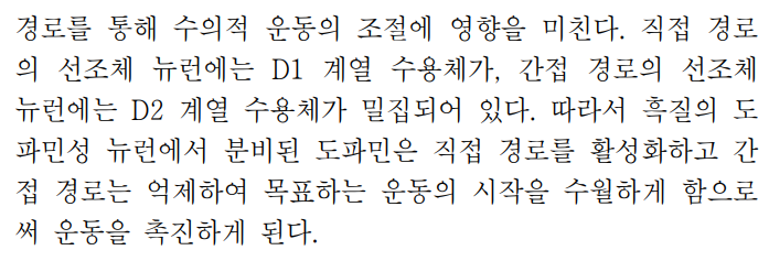 흑질에서 분비된 도파민은 직접 경로를 활성화하고, 간접 경로를 억제하여 결과적으로는 목표하는 운동을 촉진시키는 역할을 한다고 합니다.