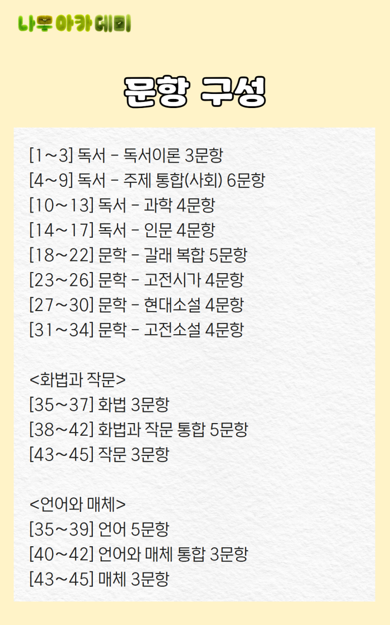 문항은 작년 수능과 비교했을 때, 신유형 없이 익숙한 구성과 문제 구성이 유지되었습니다. 따라서 작년 수능을 꼼꼼하게 공부한 학생이라면 당황하지 않고 문제를 잘 풀었으리라 생각됩니다. 화법과 작문, 언어와 매체의 경우 모두 지난해 수능모다 쉽게 출제되었습니다.
