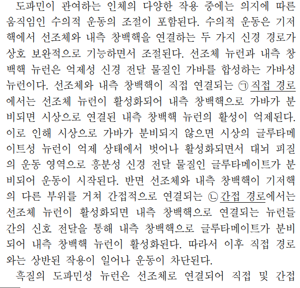 3, 4문단에 따르면 흑질의 도파민성 뉴런에서 도파민이 분비되면 직접 경로(㉠)는 활성화되고 간접 경로(㉡)는 억제되어 결과적으로 운동이 촉진돼요. 이는 두 경로 모두 결과적으로 대뇌 피질의 운동 영역으로 글루타메이트가 분비되도록 작용한다는 것을 의미하므로, '㉠은 ㉡과 달리'라는 표현이 적절하지 않습니다!