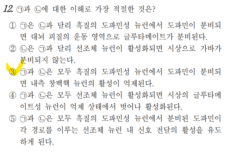 우선 12번의 답은 3번입니다. 지문 4문단에 따르면, 흑질의 도파민성 뉴런에서 분비된 도파민은 직접 경로(㉠)를 활성화하고 간접 경로(㉡)는 억제해요. 직접 경로(㉠)가 활성화되면 선조체 뉴런이 활성화되어 내측 창백핵으로 가바를 분비하므로 내측 창백핵 뉴런의 활성이 억제돼요. 간접 경로(㉡)의 경우, 본래 선조체 뉴런이 활성화되어야 내측 창백핵이 활성화되는데, 이 경로 자체가 도파민에 의해 억제되므로 결과적으로 내측 창백핵 뉴런의 활성 역시 억제되는 것이죠.