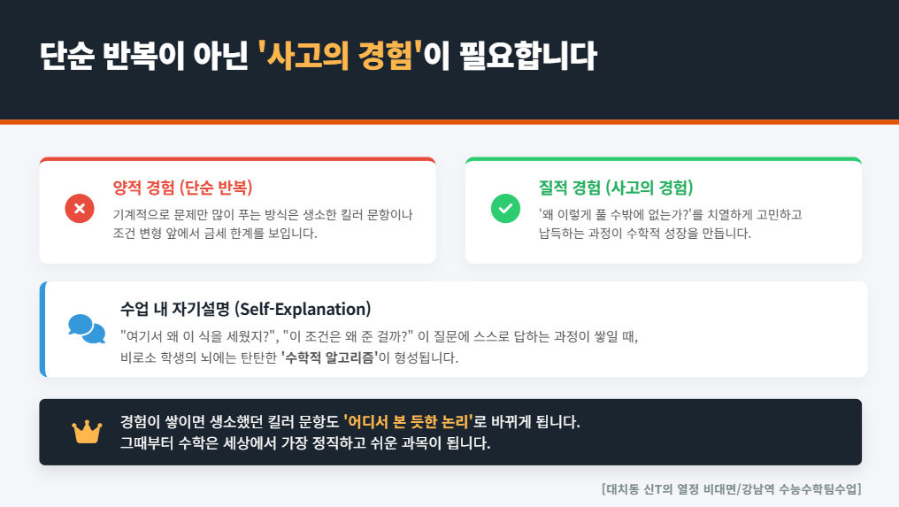 중요한 건 단순히 문제만 많이 푸는 '양적 경험'이 아닙니다. '왜 이렇게 풀 수밖에 없는가?'를 납득하는 '질적 경험'이 필요합니다.